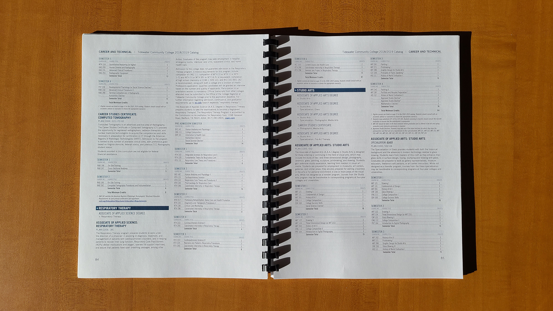 The college catalog is a massive printed piece, with a hundred plus pages and several different sections with completely different styles. This was designed once per year, but took months of work to finally come up with a finished product.