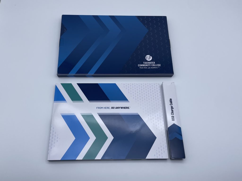 The outer protective packaging (top) the exterior of the brochure, which contains the video brochure (lower left) and the packaging for the USB charging cable (lower right).