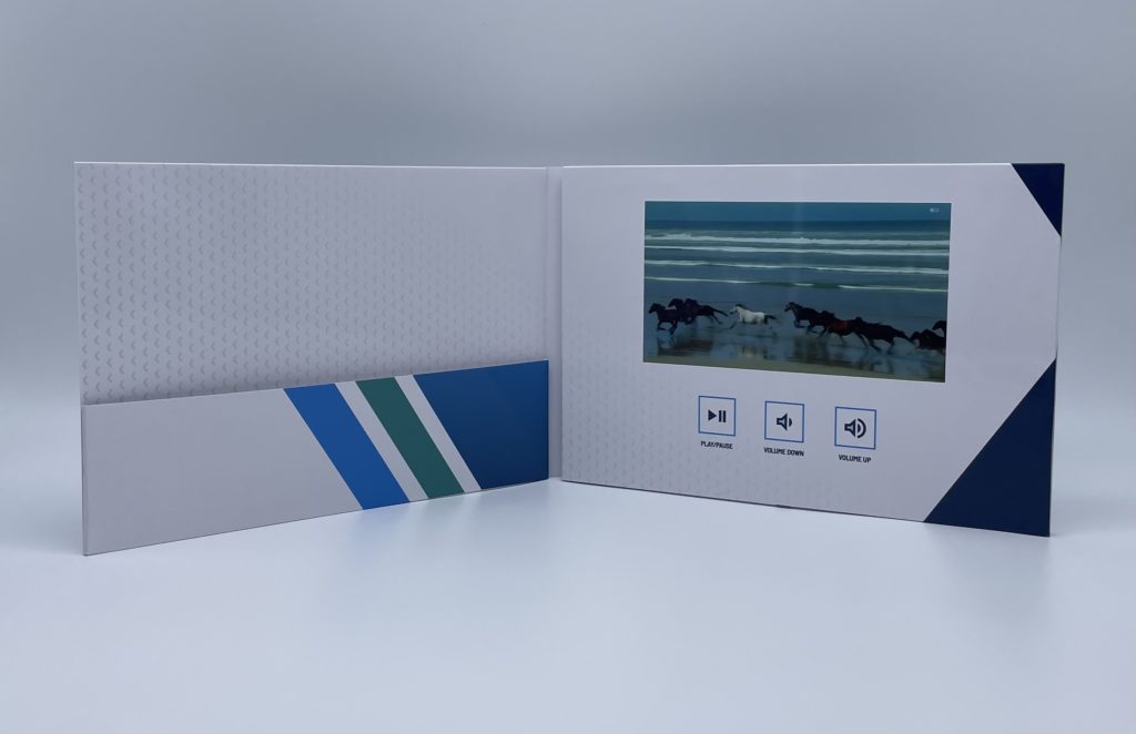 Interior view of the video brochure. There are buttons for the video and volume, and a flap on the verso to hold any printed materials supporting the message.
